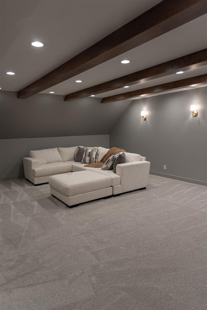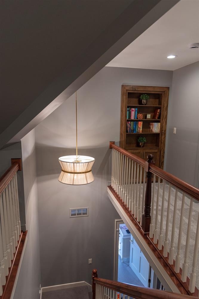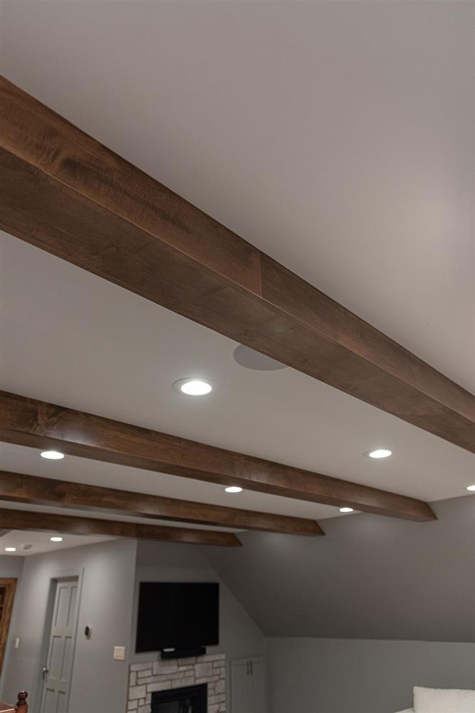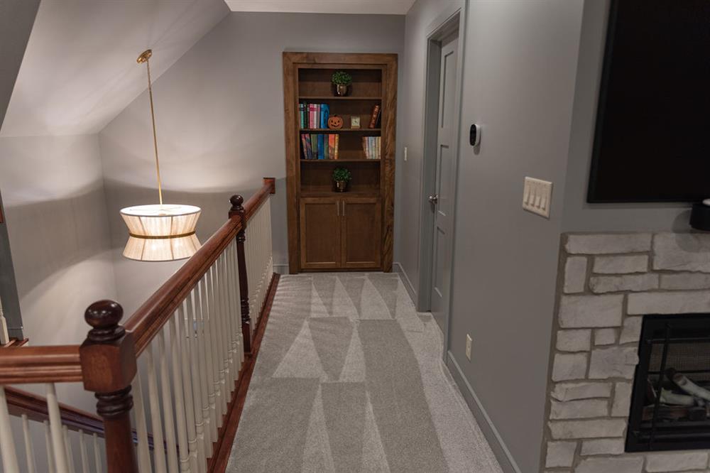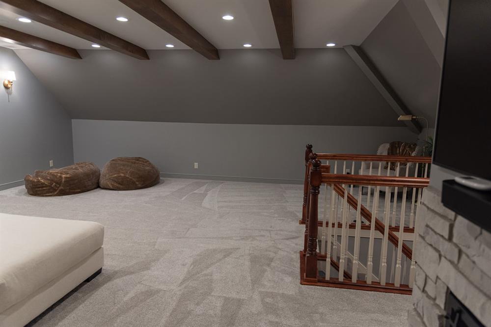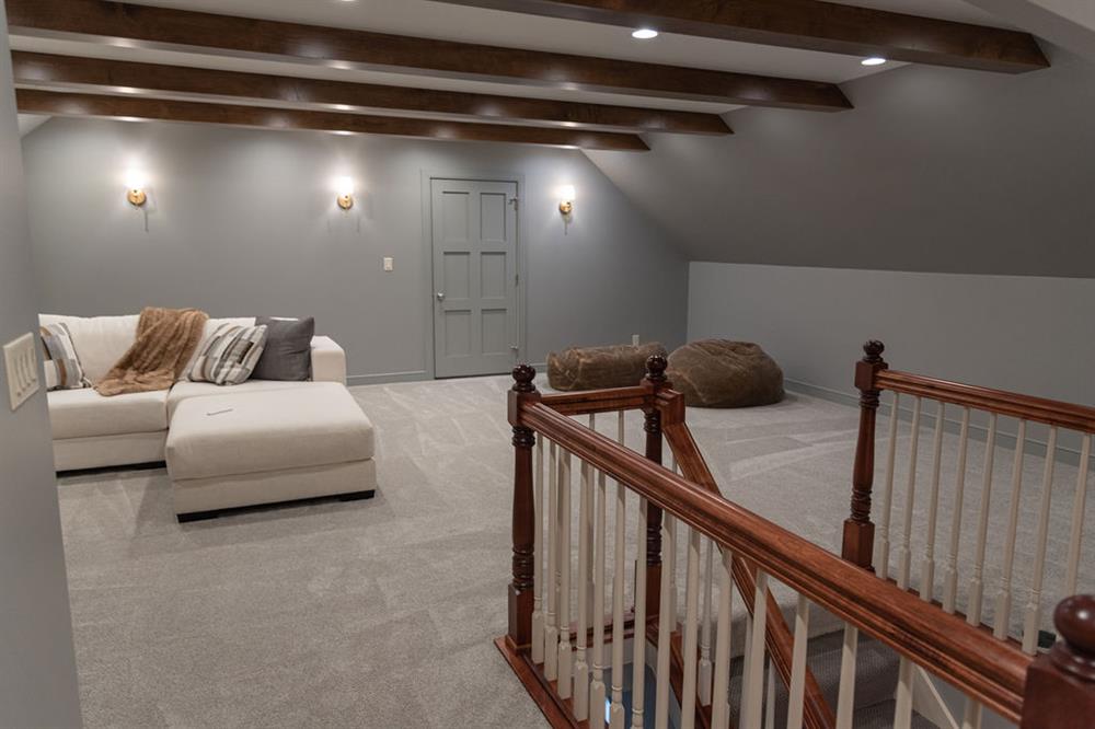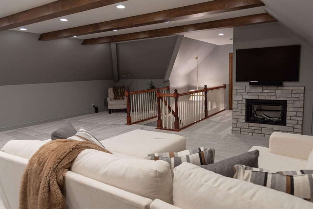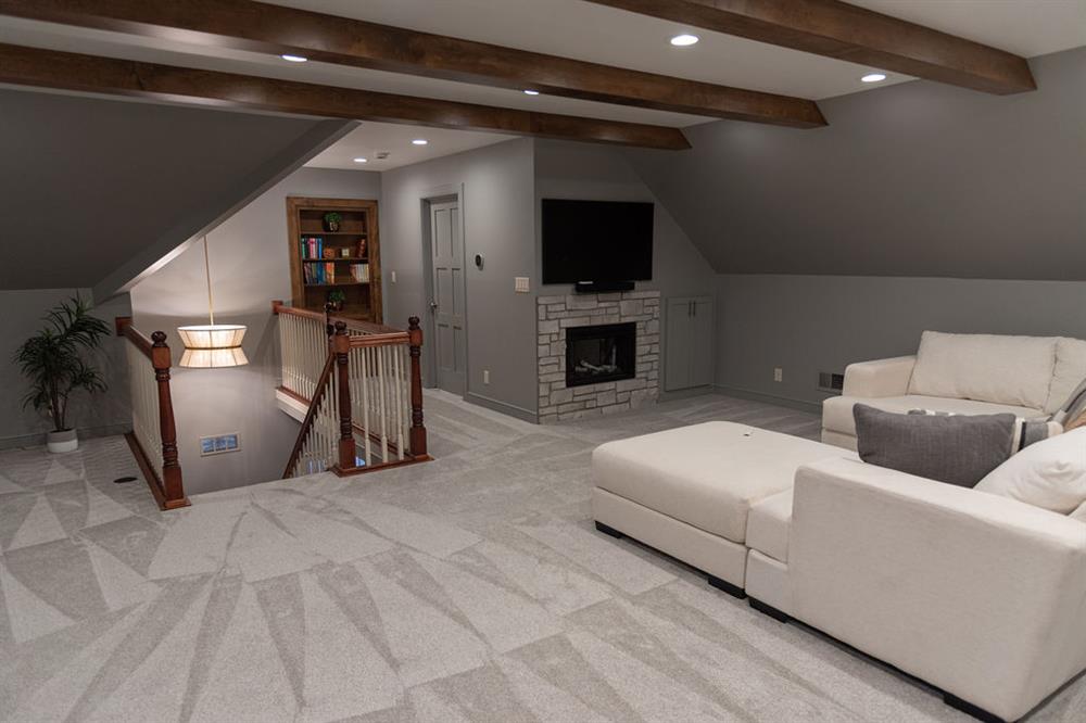 Our team transformed the attic into a finished living area. We installed dark wood beams across the vaulted ceiling and built a custom recessed bookshelf near the stairwell. The team framed a fireplace and applied a rough-cut stone veneer surround. Electricians added recessed LED lighting and wall sconces to brighten the room. Finished the floor with plush grey carpeting and painters applied a monochromatic grey scheme to the walls, doors and trim.