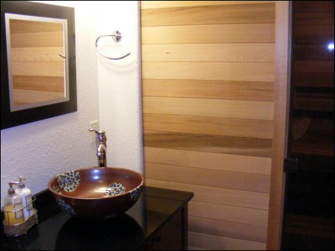 This Hartland basement remodel features warm tones and lighting to create a comfortable space for entertaining. The wine cellar has faux painted walls for a rustic feel, while the white walls around the basement have a modern feel. The new bathroom has a neo-angle tiled shower stall and a modern stand-alone sink. The new workout room has mirrors and a TV to create the feel of a commercial gym without compromising style.